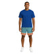 Model wearing Breakin' Atoms "Star-Spangled Shorts," featuring a bold navy blue and cream color block design with scattered star prints — a modern twist on patriotic fashion perfect for summer and festival wear.