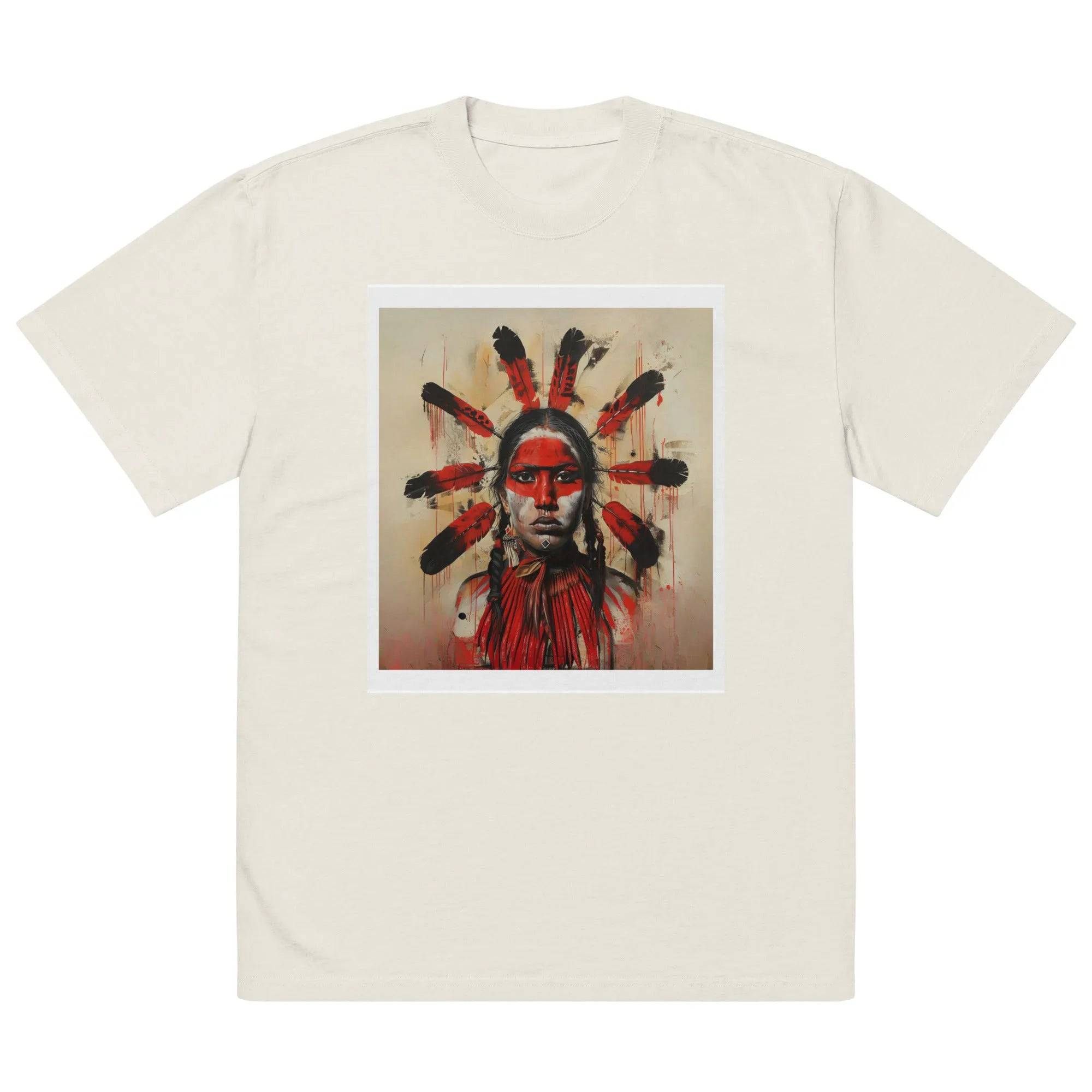 The "Red Sovereign" tee features a powerful image of a Native American figure adorned with red face paint and feathers. This striking artwork, rendered in bold and evocative strokes, symbolizes the strength, resilience, and sovereignty of indigenous peoples. The vivid red accents against the neutral backdrop create a visual statement...