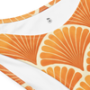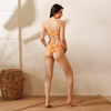 Deco Bloom pairs a structured bandeau top with high-cut bottoms in a print that channels vintage glamour and coastal heat. The soft stretch fabric molds without pinch, while clean lines and full lining ensure a smooth, sculpted fit. Art Deco shellwork in citrus tones gives it a golden-hour glow, from rooftop to shoreline.
