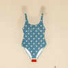 The "Eternal Stars" swimsuit features an all-over pattern of stars set against a vintage blue background, invoking the timeless beauty of the night sky. This celestial motif symbolizes the enduring hope and the relentless pursuit of liberty that has shaped the American narrative. The subtle Breakin' Atoms logo graces the front, adding a touch of elegance and brand identity.