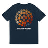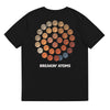A Black tee or Navy Tee built around a full lunar cycle. Thirty-nine moons arranged in a circular formation, fading from soft ivory to deep red and into navy. Each moon is different, but none stand alone—like memory, motion, or time. Breakin’ Atoms is printed below the arrangement in white block lettering.