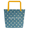 The "Stars & Stripes Tote" features a classic American flag-inspired design with a modern twist. The star-spangled blue field and bold red and cream stripes evoke a sense of national pride and timeless elegance. The contrasting yellow handles add a pop of color, enhancing the overall aesthetic and ensuring a comfortable carry.
