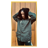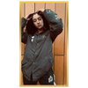 his version of the Breakin' Atoms Coach’s Jacket is cut from green, built to block out wind and push through weather. It keeps the same structure as the satin release—snap buttons, elastic cuffs, and front pockets—but trades sheen for function.