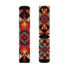 It's important to note that the dark color prints on these socks might make the side-seams more noticeable, a small reminder of the unique process that brings our vibrant tribal patterns to life. Printed with a flat sublimation method, there may be a slight color discrepancy on the side seams, adding character and uniqueness to each pair.